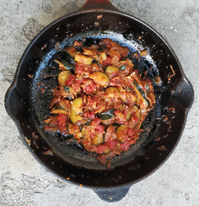 2 servings side dish 1 tablespoon sunflower oil1 onion, thinly sliced3 garlic cloves, crushed1/2 inch piece ginger, finely matchsticked1/2 tsp cumin seeds1 medium tomato, cubed1/2 tsp salt, or more to taste1/2 tsp coriander powder1/4 tsp black pepper powder1/2 tsp red chilli powder2 small courgettes cut …